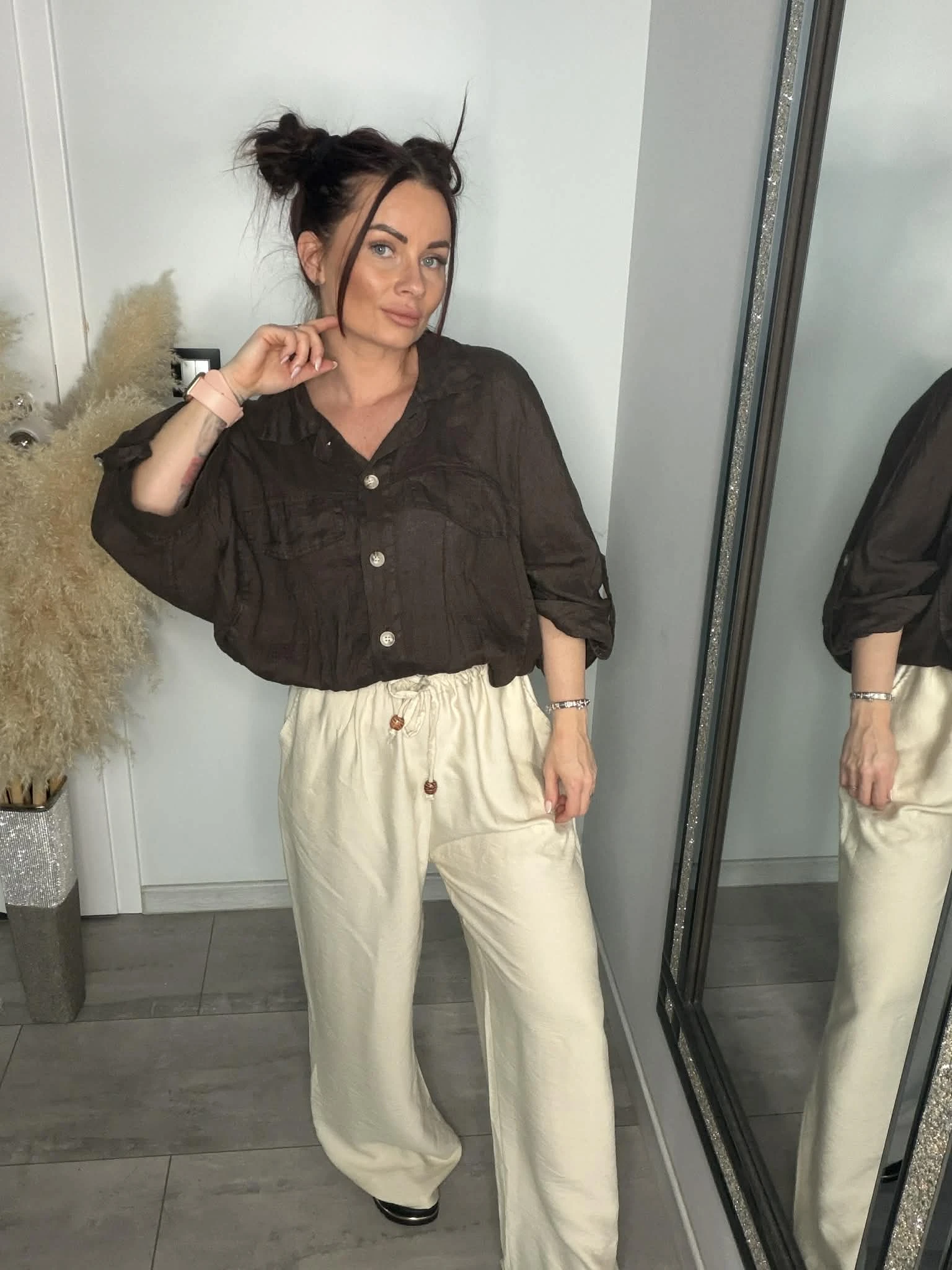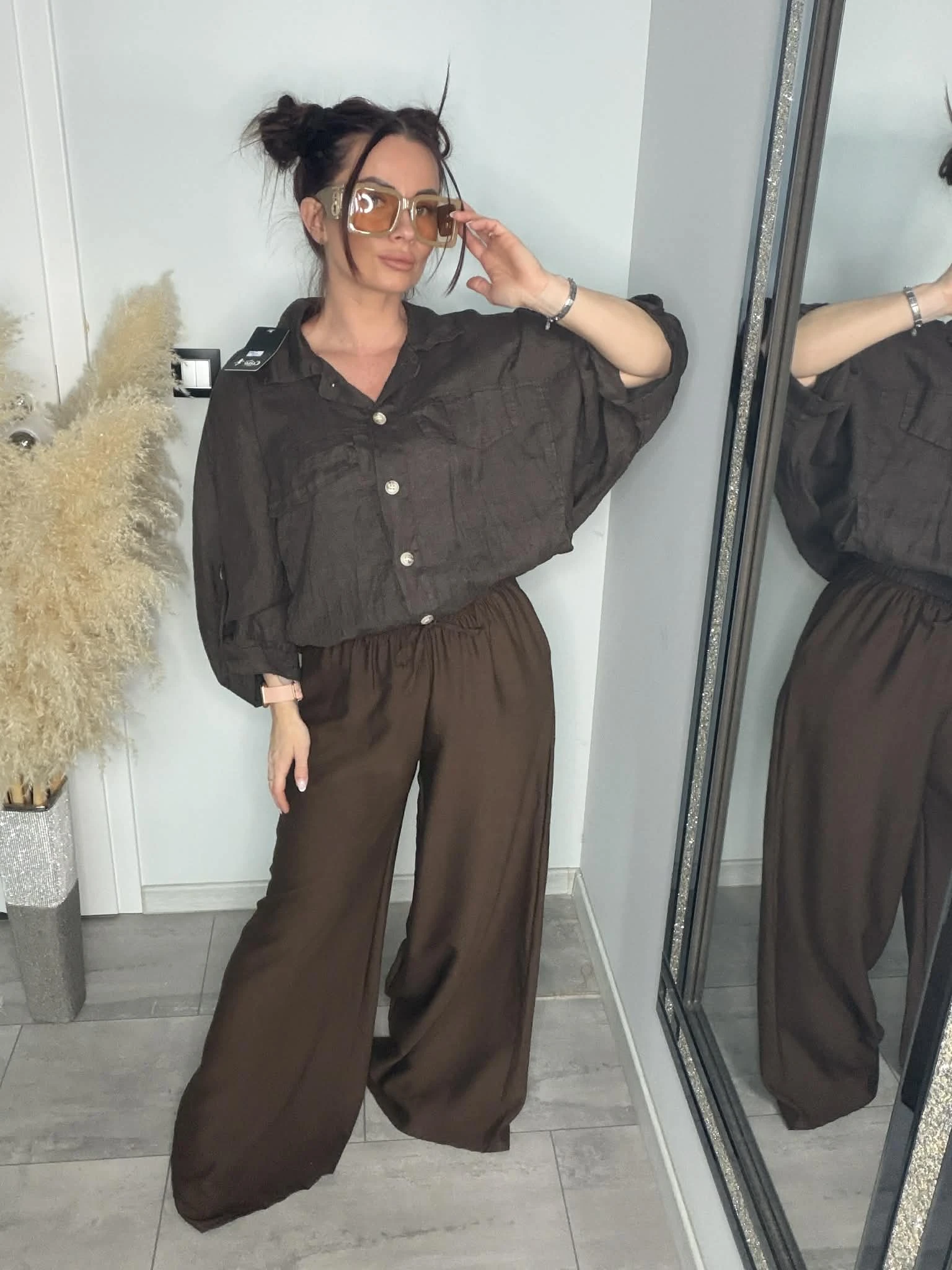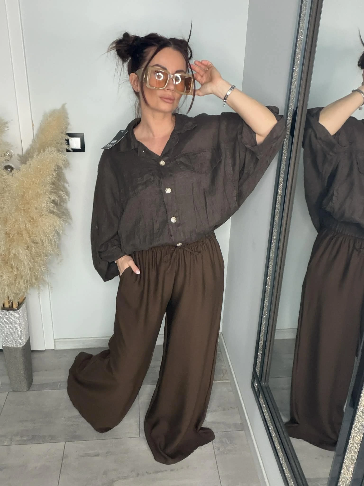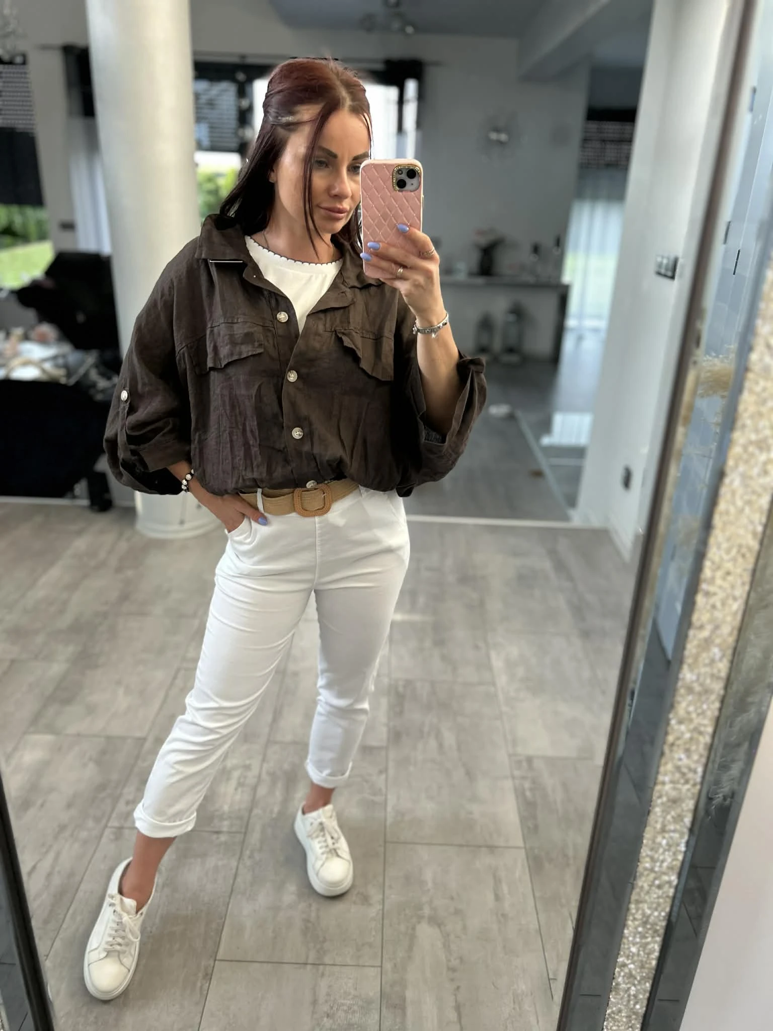 Stylowa koszula o luźnym, oversizowym kroju, wykonana w 100% z naturalnego lnu. Lekka, przewiewna i idealna na cieplejsze dni. Model z rękawem 3/4, zakończony gumką w pasie, która pięknie układa sylwetkę. Z przodu kieszenie oraz ozdobne patki, które dodają charakteru. Piękny, głęboki odcień brązu świetnie wpisuje się w naturalne stylizacje.