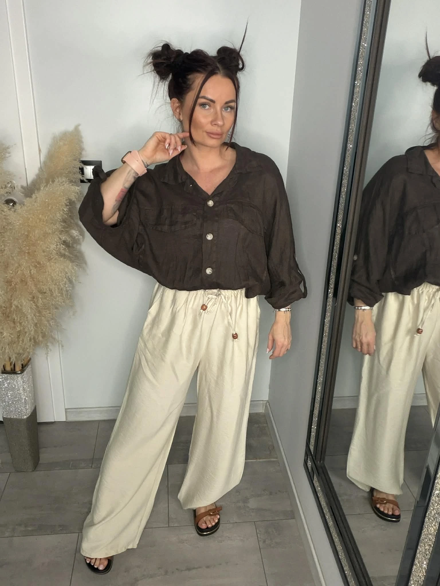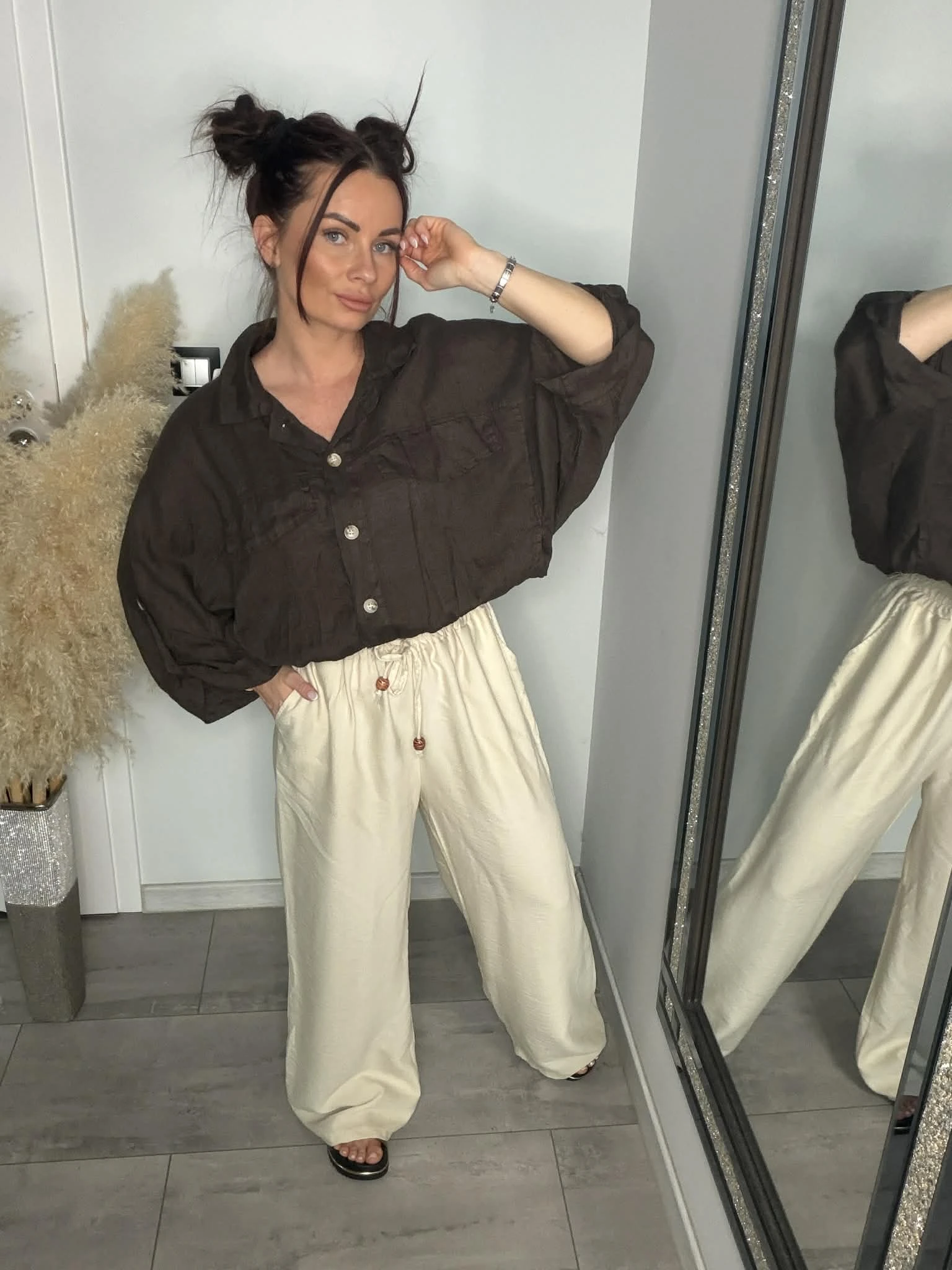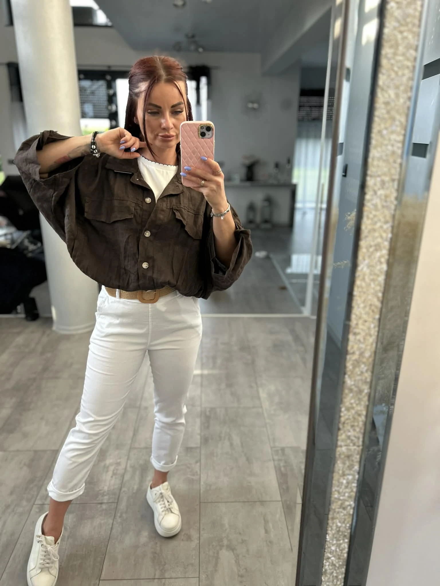 Stylowa koszula o luźnym, oversizowym kroju, wykonana w 100% z naturalnego lnu. Lekka, przewiewna i idealna na cieplejsze dni. Model z rękawem 3/4, zakończony gumką w pasie, która pięknie układa sylwetkę. Z przodu kieszenie oraz ozdobne patki, które dodają charakteru. Piękny, głęboki odcień brązu świetnie wpisuje się w naturalne stylizacje.