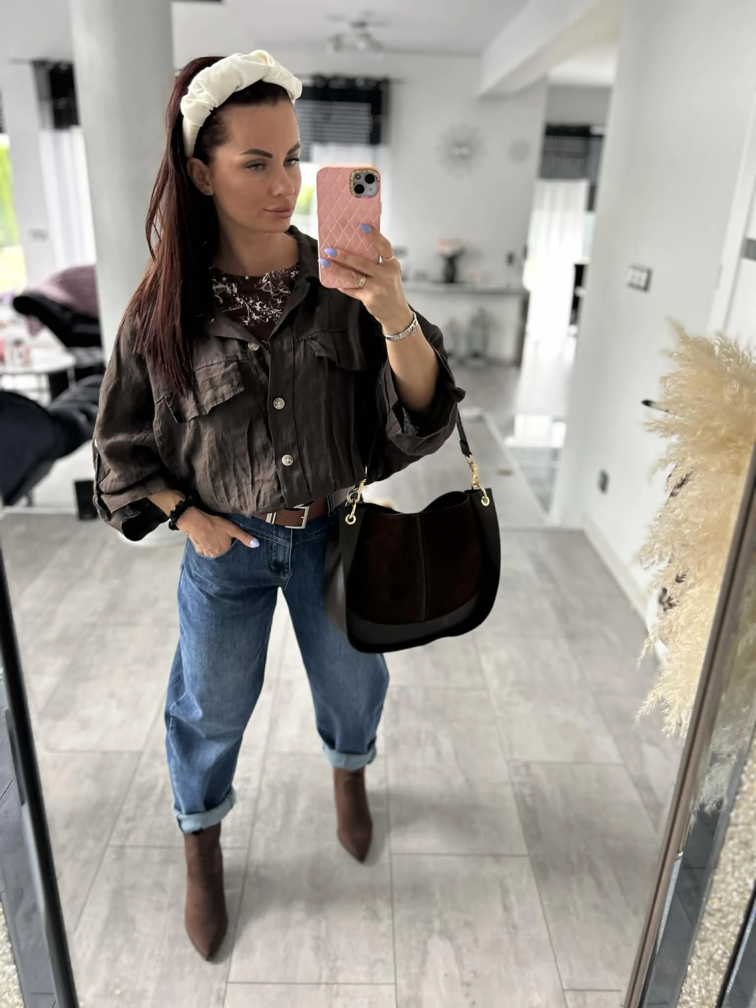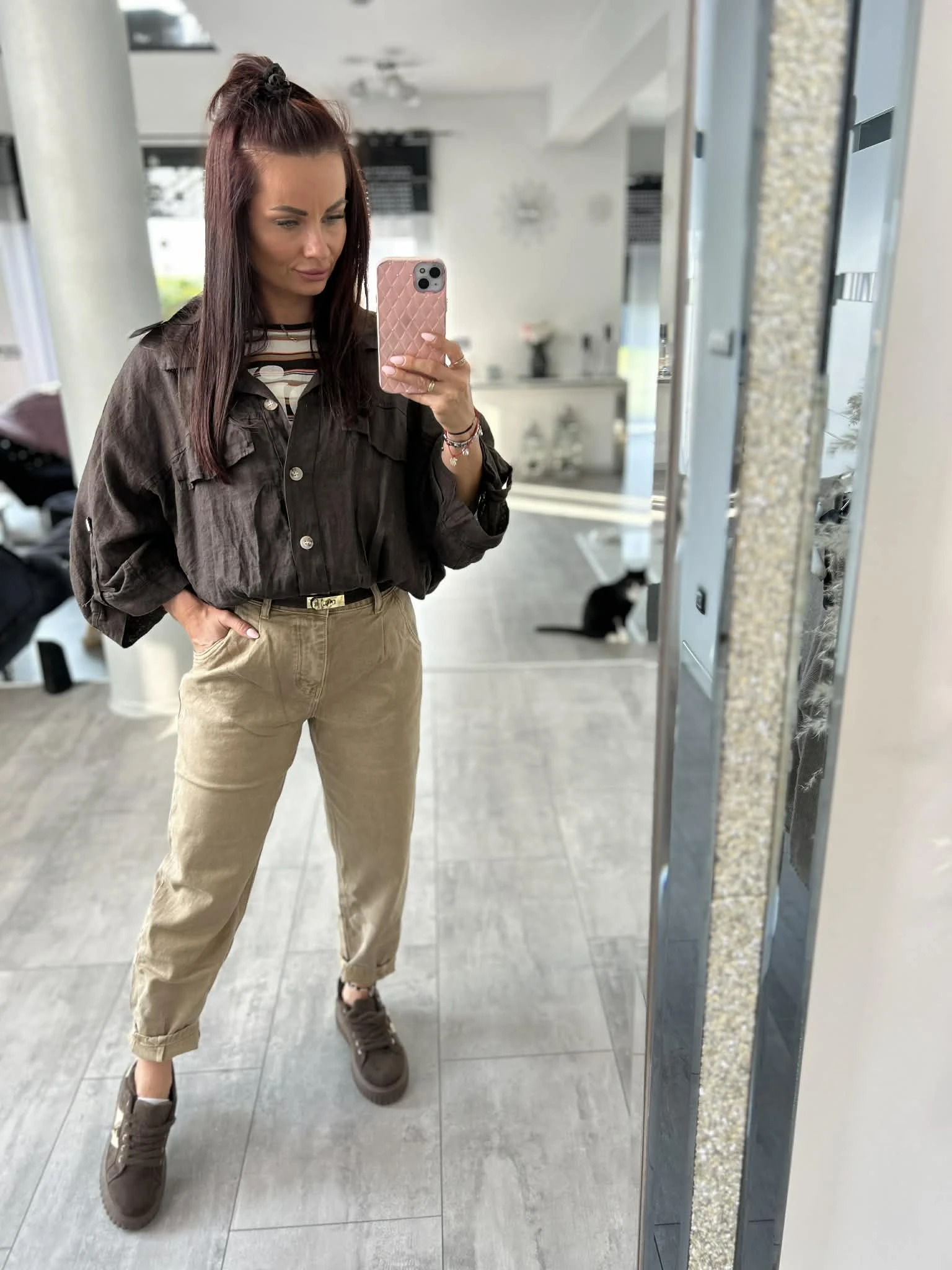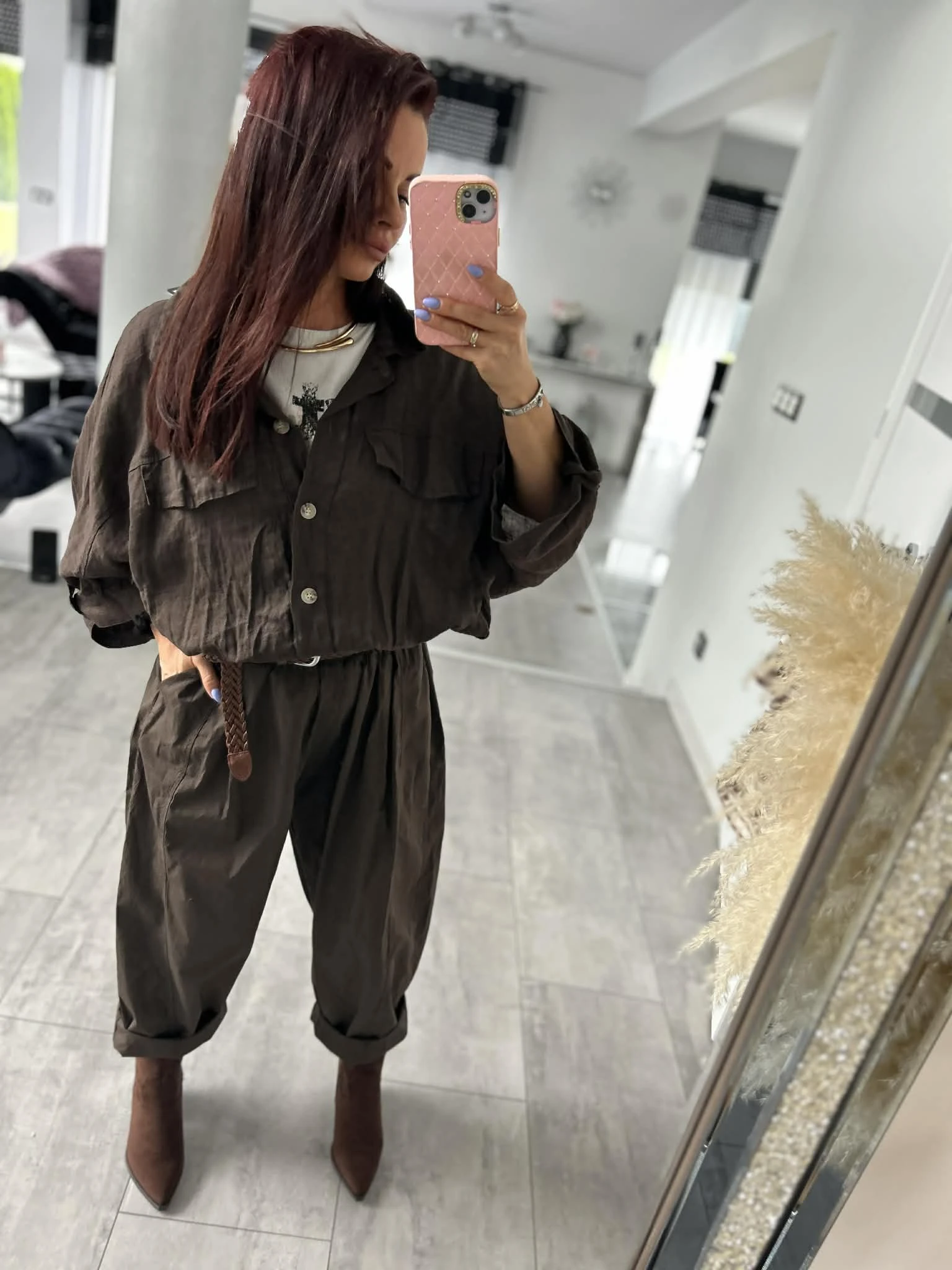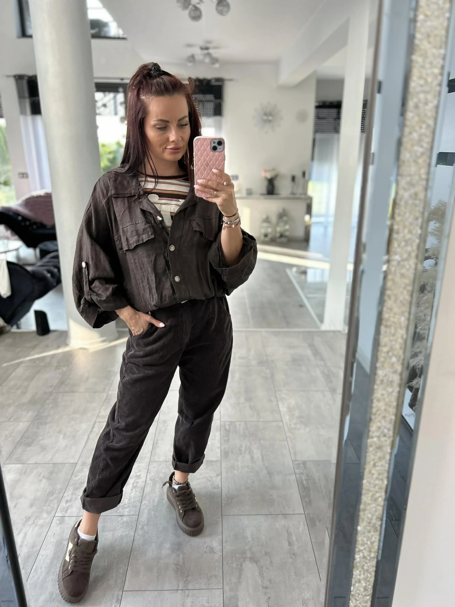 Stylowa koszula o luźnym, oversizowym kroju, wykonana w 100% z naturalnego lnu. Lekka, przewiewna i idealna na cieplejsze dni. Model z rękawem 3/4, zakończony gumką w pasie, która pięknie układa sylwetkę. Z przodu kieszenie oraz ozdobne patki, które dodają charakteru. Piękny, głęboki odcień brązu świetnie wpisuje się w naturalne stylizacje.
