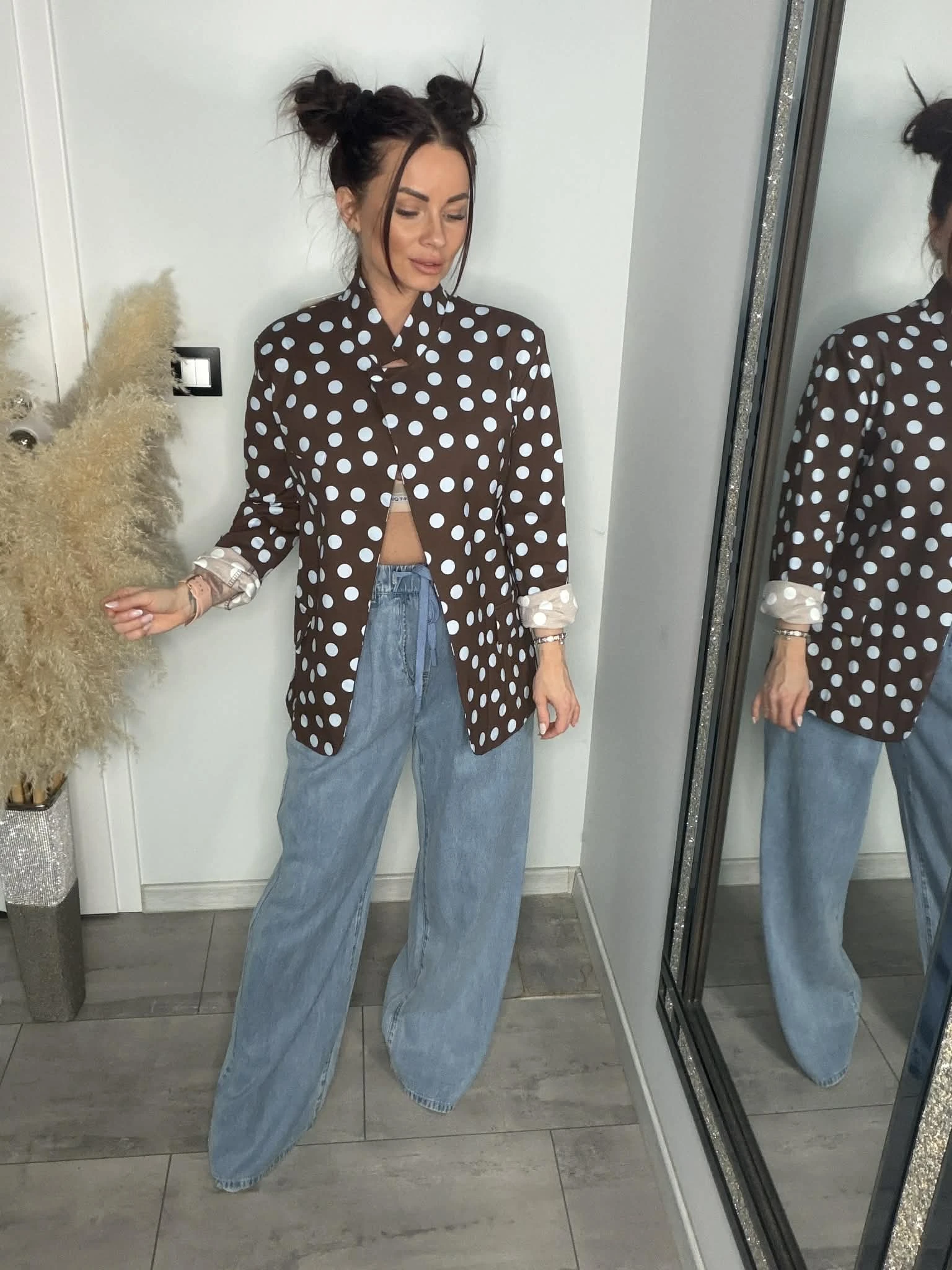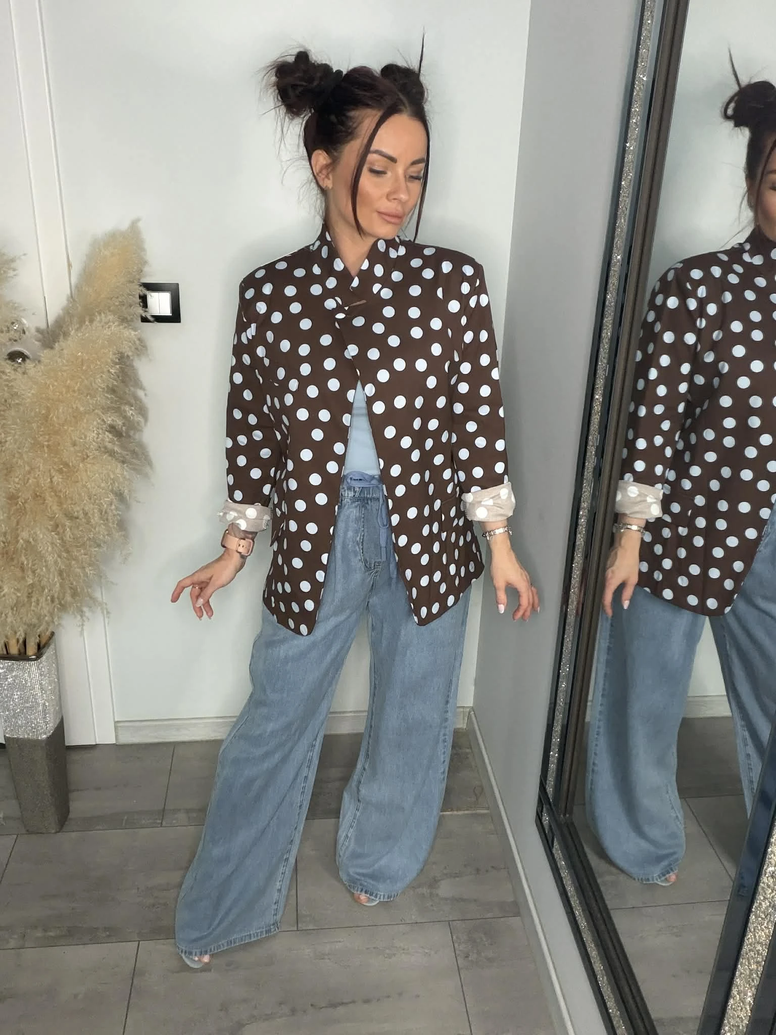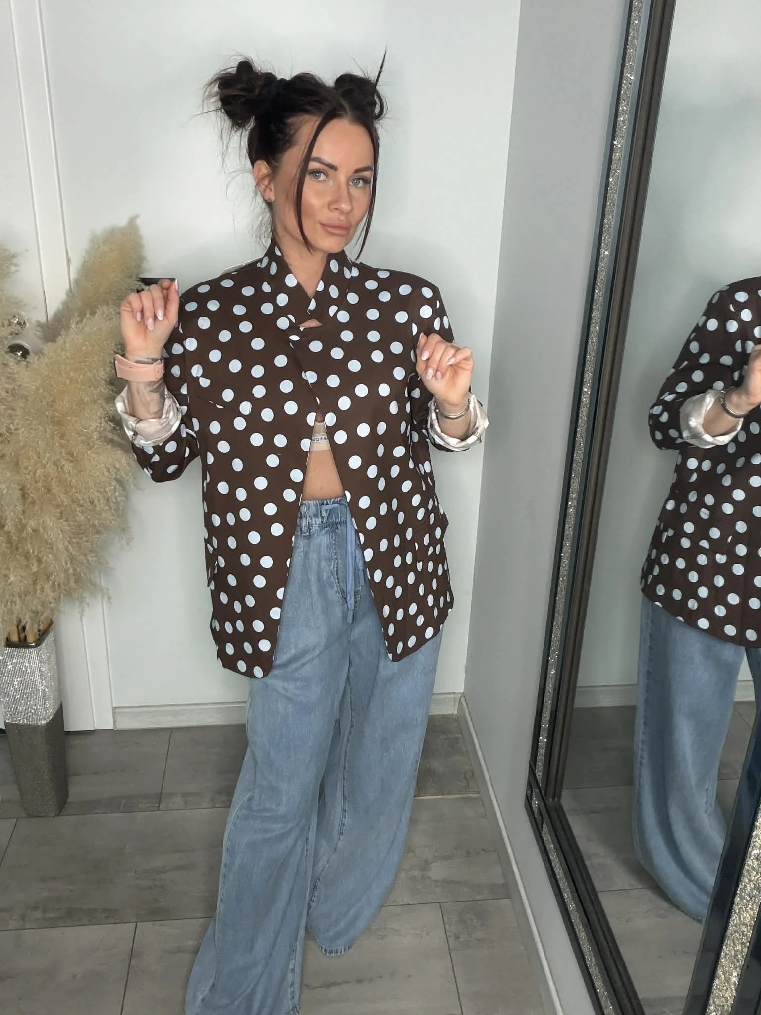 Stylowa marynarka w grochy, która dodaje charakteru każdej stylizacji. Lekko luźniejszy fason oraz delikatne poduszki na ramionach pięknie podkreślają sylwetkę i nadają jej modnej formy. Dzięki wysokiej zawartości bawełny materiał jest miękki, przyjemny w dotyku i oddychający, a dodatek elastanu zapewnia komfort i dopasowanie. Możesz nosić ją klasycznie z topem lub bardziej odważnie – na stanik, tworząc modny, letni look. Idealna do jeansów, eleganckich spodni czy szortów – model, który robi całą stylizację.