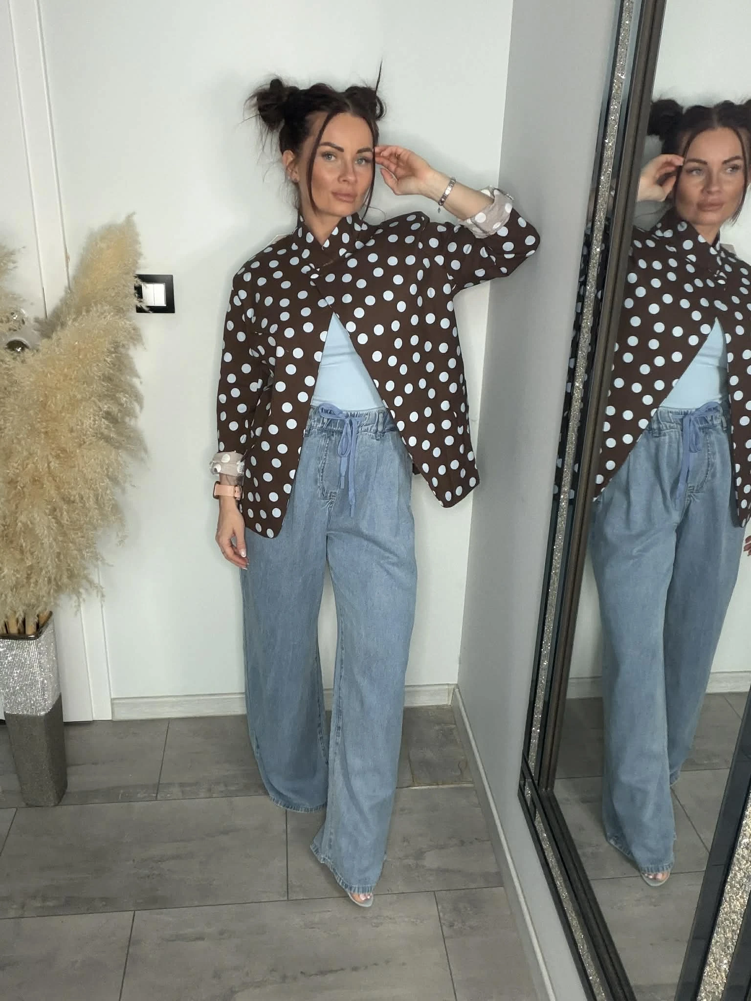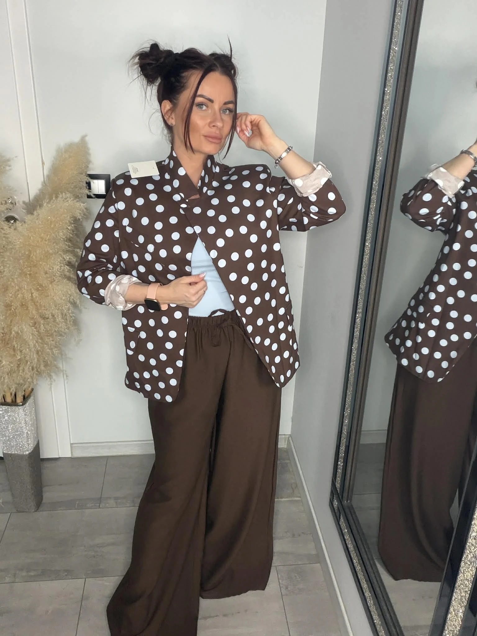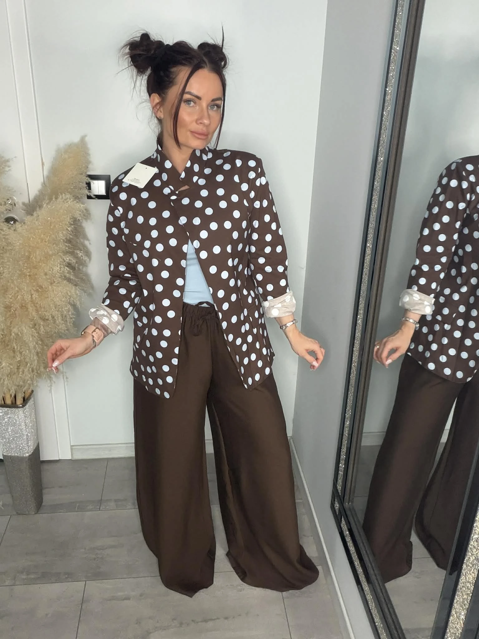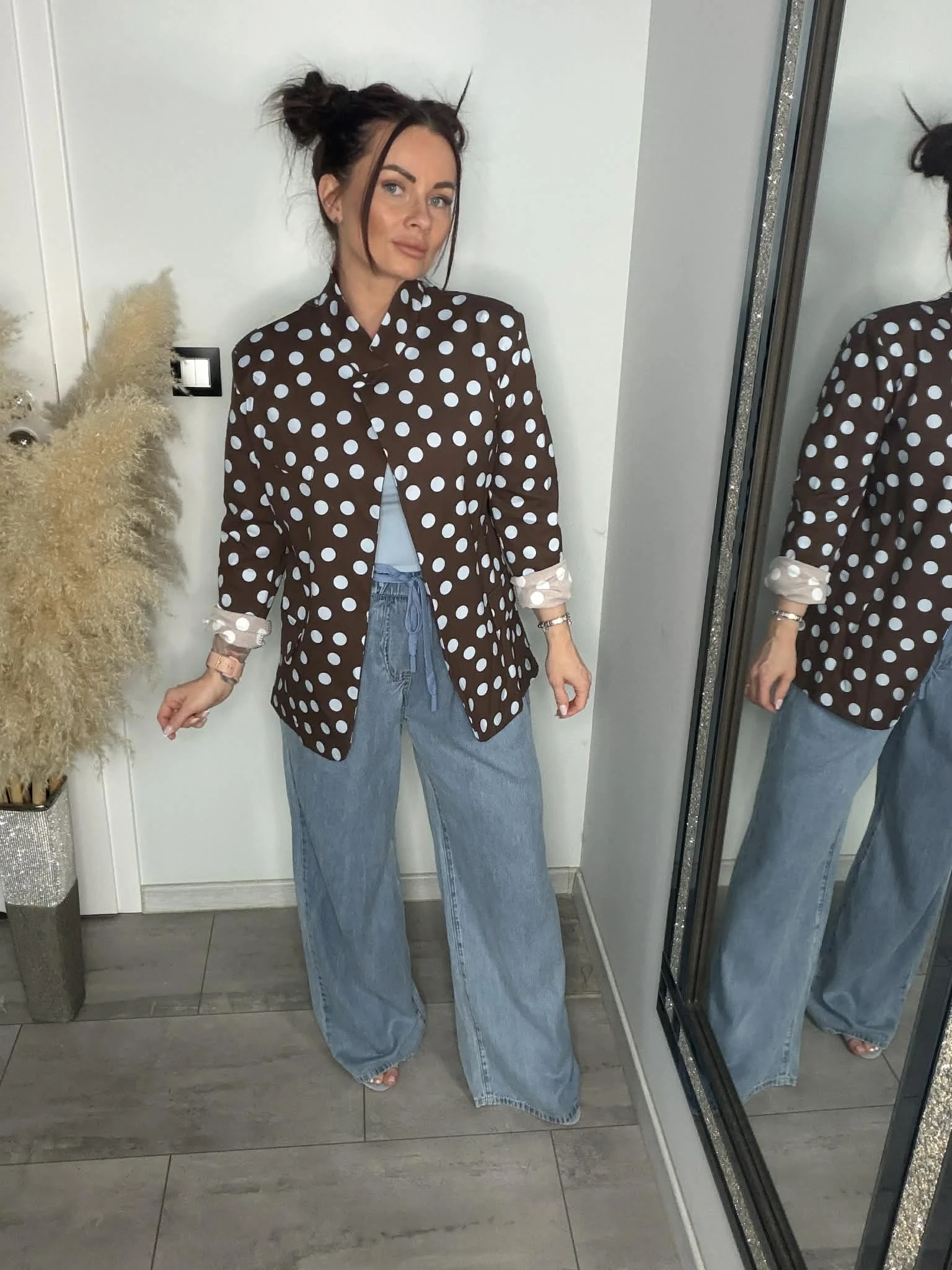 Stylowa marynarka w grochy, która dodaje charakteru każdej stylizacji. Lekko luźniejszy fason oraz delikatne poduszki na ramionach pięknie podkreślają sylwetkę i nadają jej modnej formy. Dzięki wysokiej zawartości bawełny materiał jest miękki, przyjemny w dotyku i oddychający, a dodatek elastanu zapewnia komfort i dopasowanie. Możesz nosić ją klasycznie z topem lub bardziej odważnie – na stanik, tworząc modny, letni look. Idealna do jeansów, eleganckich spodni czy szortów – model, który robi całą stylizację.