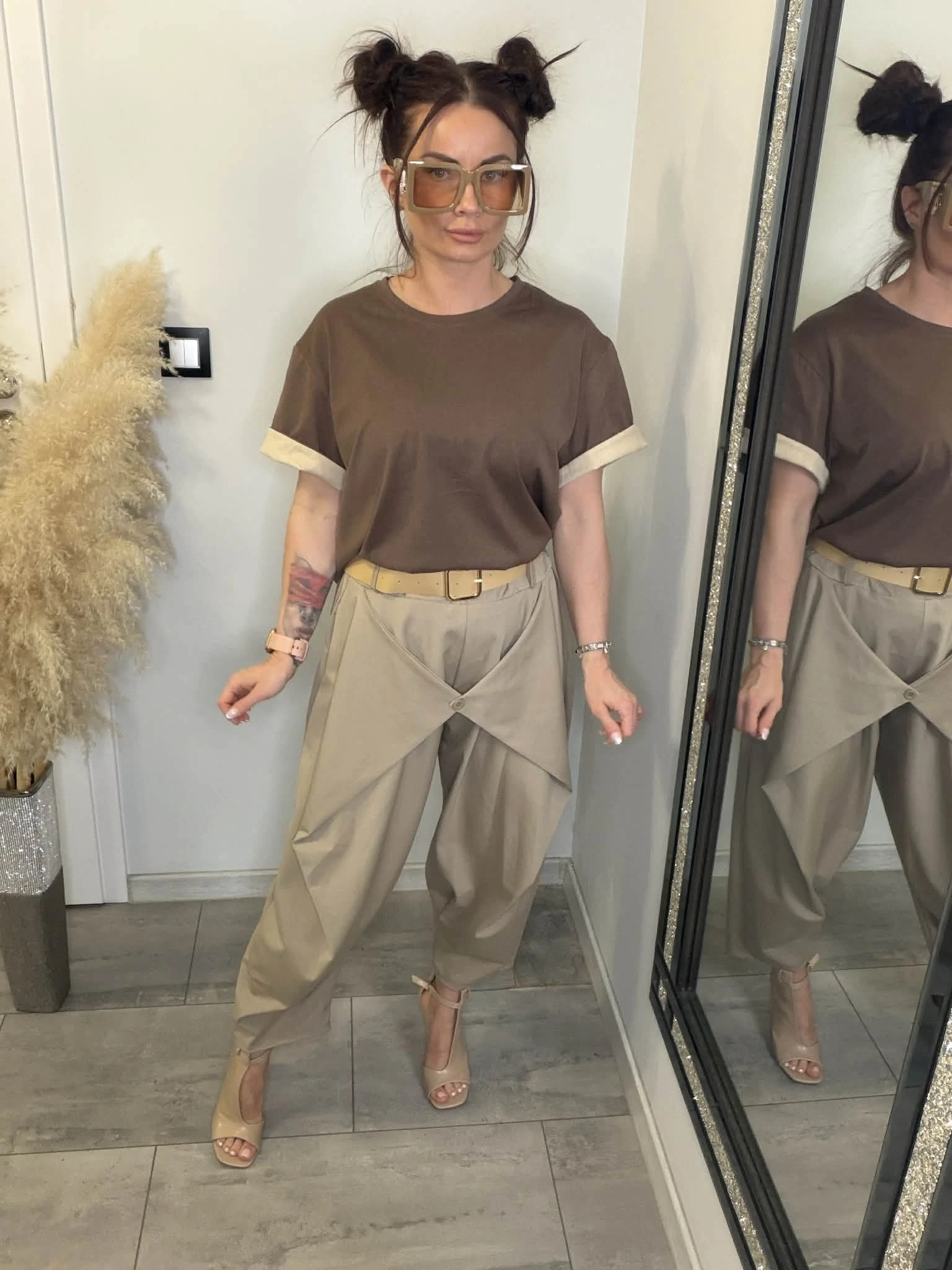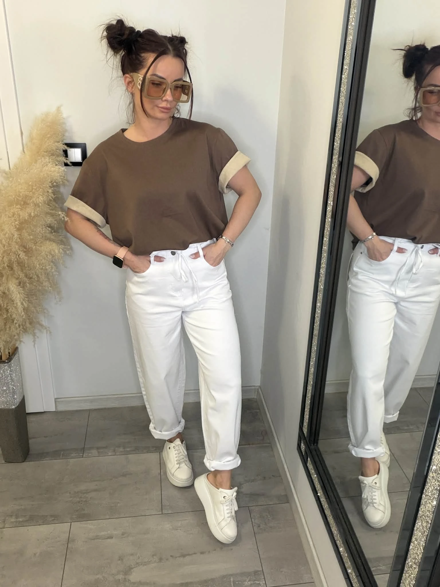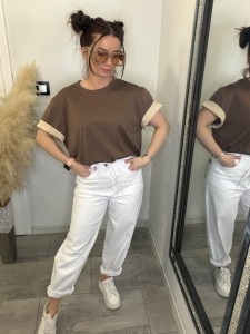 Stylowy t-shirt o luźnym, komfortowym fasonie, który łączy klasykę z modnym detalem. Model wyróżnia się kontrastowym wykończeniem rękawów – po podwinięciu odsłania się jaśniejszy materiał, który dodaje całości charakteru i lekko sportowego vibe’u. Wykonany z miękkiej, przyjemnej w dotyku bawełny, idealnie sprawdzi się w codziennych stylizacjach – zarówno do jeansów, jak i bardziej eleganckich spodni. To baza, która robi stylizację.